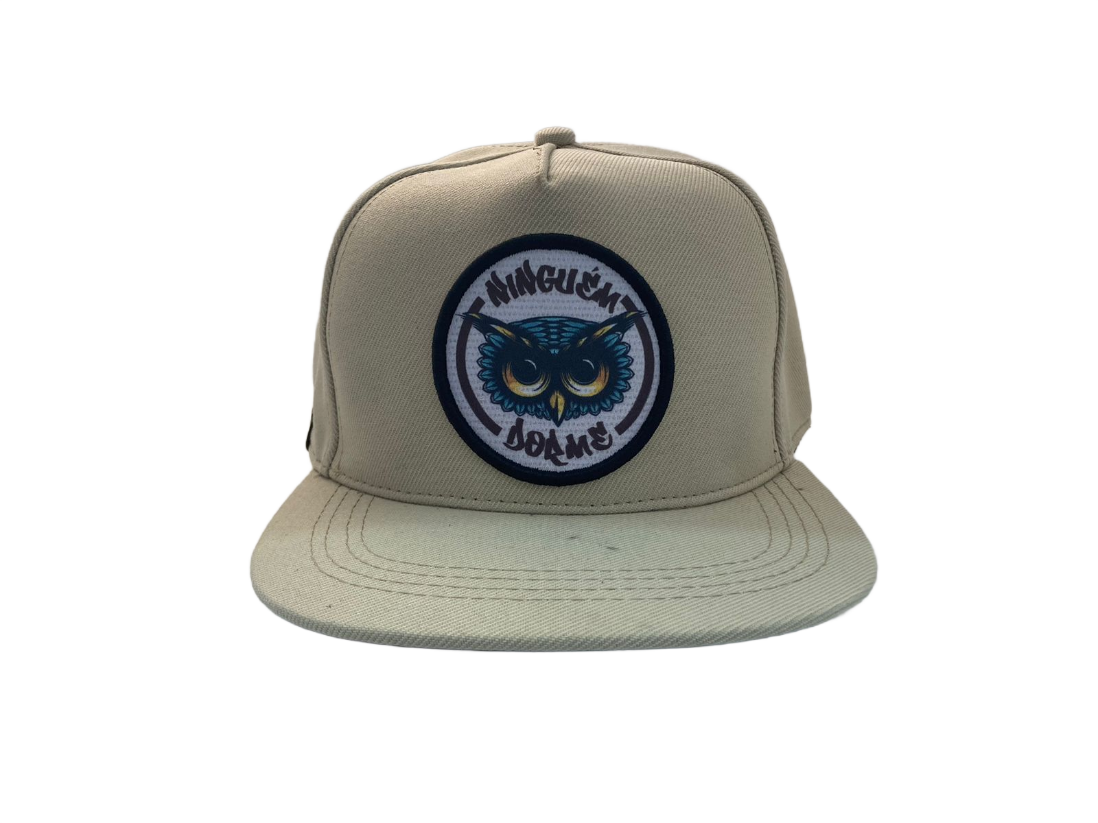 Boné snapback bege com estampa de coruja e a frase “Ninguém Dorme”. Modelo com aba reta e visual marcante para compor seu estilo.