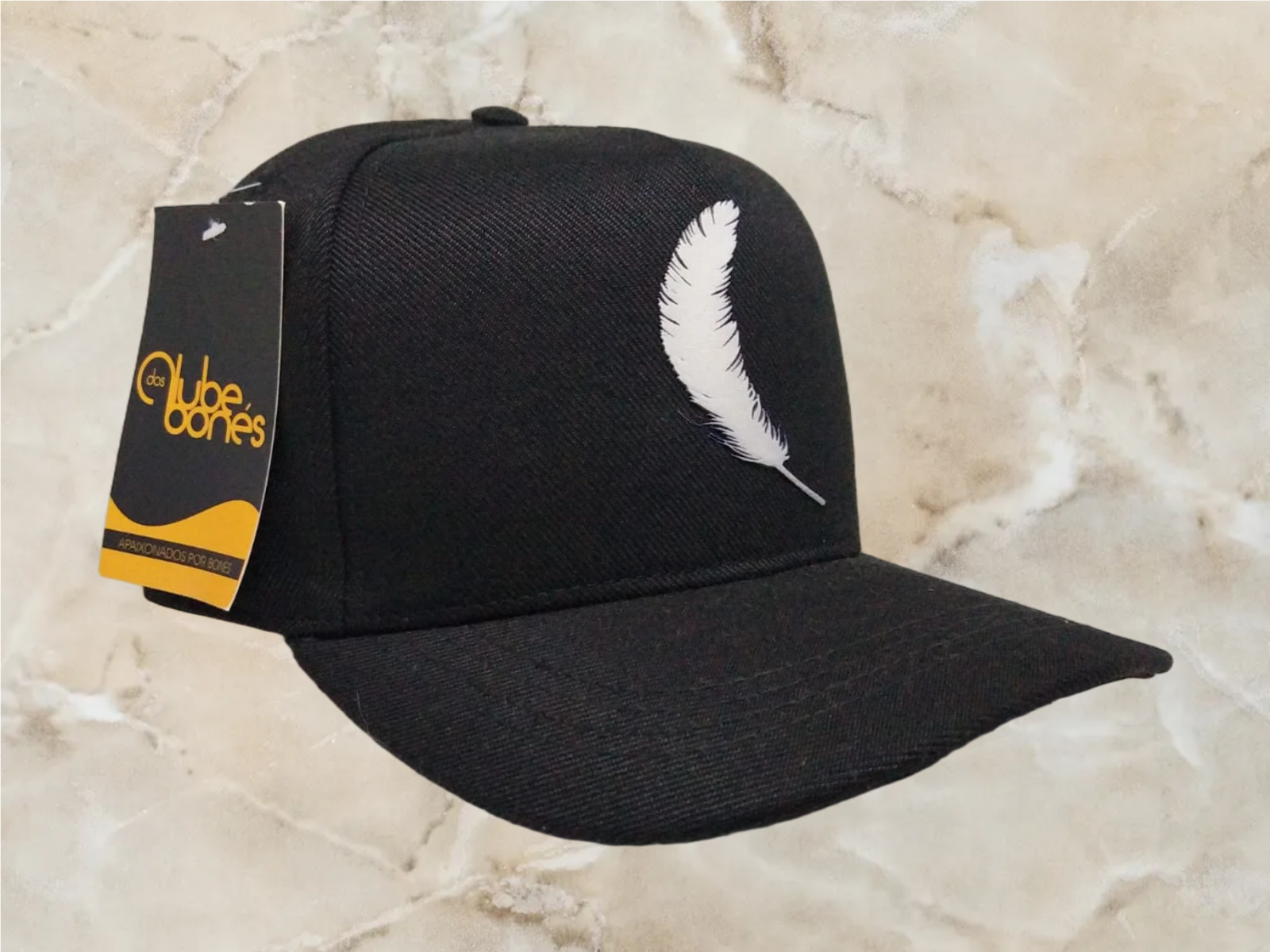 Boné preto com bordado minimalista de pena branca e assinatura estilizada. Design sofisticado com pegada urbana