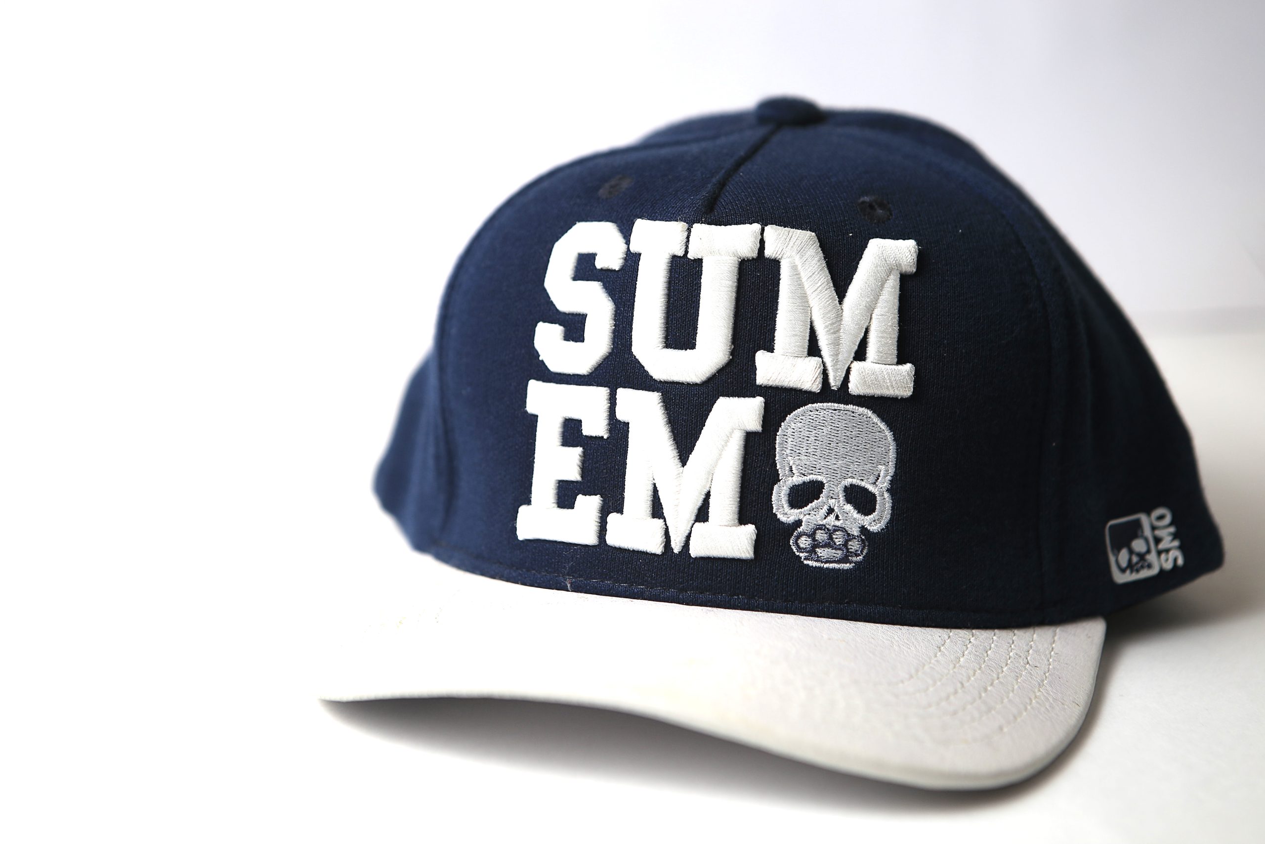Boné estilo snapback da marca SUMEMO, com base azul marinho, aba branca e bordado frontal em alto relevo com a frase “SUMEMO” e caveira estilizada. Visual marcante e urbano, ideal pra quem tem atitude.